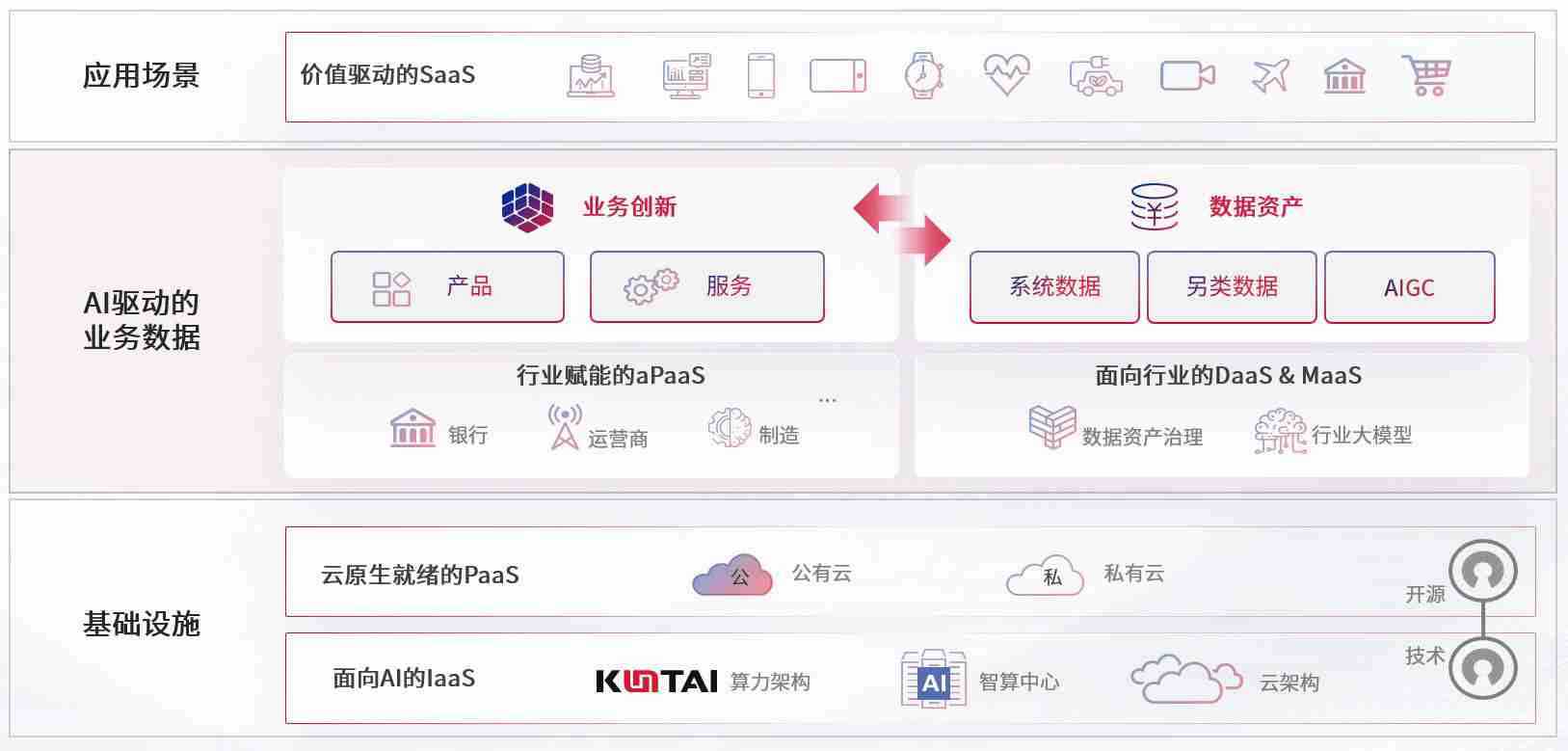 数字时代,,,围绕企业数字化转型的关键要素,,,杏宇娱乐数码开创性的提出数云融合战略和技术体系框架,,,,着力在云原生、、、、数字原生、、、、AI原生和信创产业上架构产品和服务能力,,为处在不同数字化转型阶段的快消零售、、、、汽车、、、金融、、、、医疗、、、、政企、、教育、、运营商等行业客户提供泛在的敏捷IT能力和融合的数据驱动能力,,,,构建跨界融合创新的数字业务场景和新业务模式,,助力企业级客户建立面向未来的核心能力和竞争优势,,,,全面推动社会的数字化、、、智能化转型升级。。。