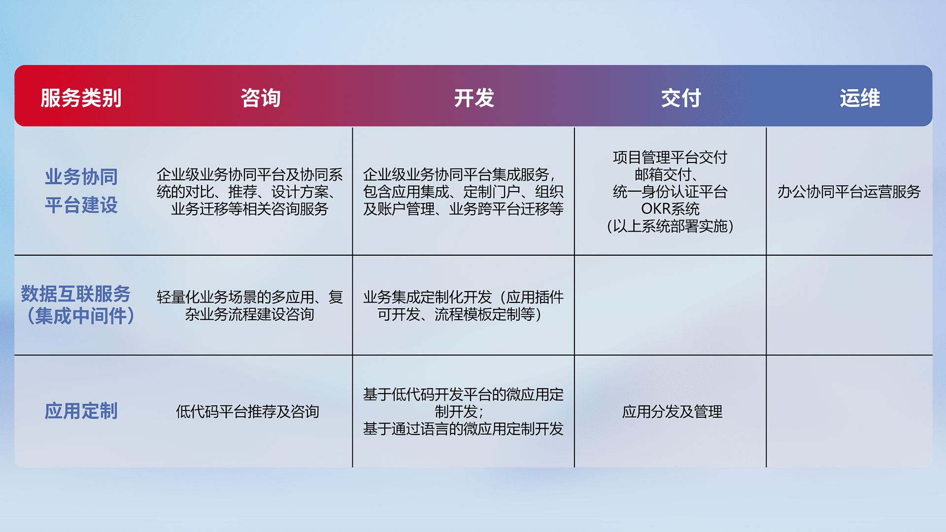 针对钉钉、、、企微、、、IDaas等平台级产品提供产品的规划、、方案、、、、交付、、、、定制化开发等服务,,,实现如统一协同办公、、智能客户服务、、、、混合会议管理、、智能数据查询、、等业务场景,,实现数字化转型。。